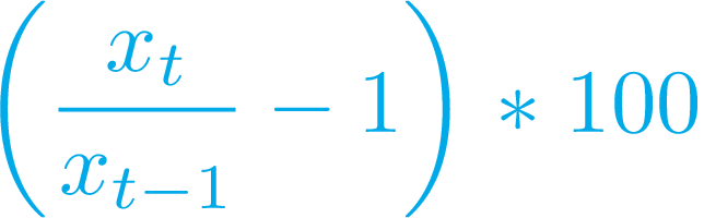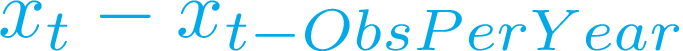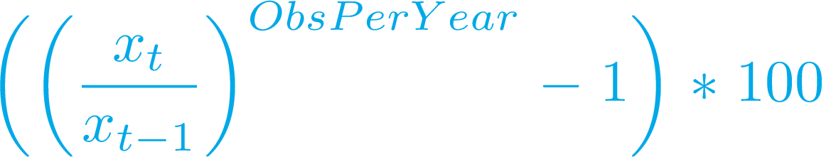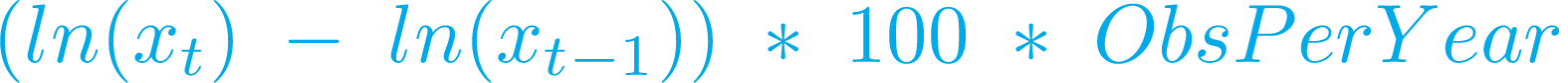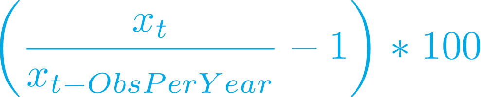 In these formulas, xt stands for the value of the series x at the time period of t; ObsPerYear stands for the number of observations per year. For daily aggregation it's equal to 260 (as no values are recorded on weekends), for annual - 1, monthly -12, quarterly - 4, biweekly - 26, weekly - 52.