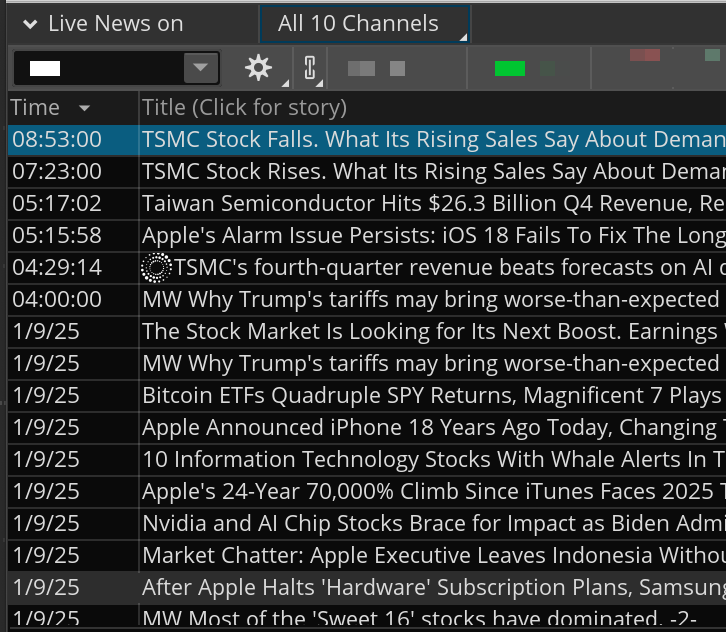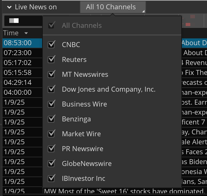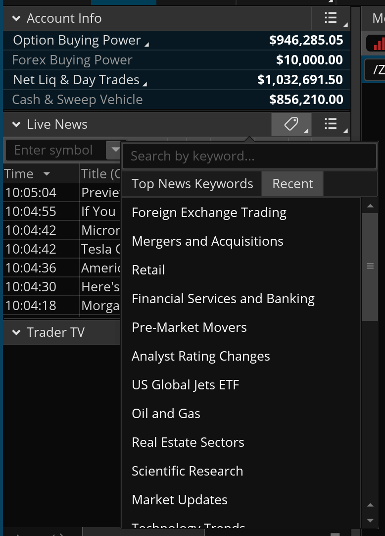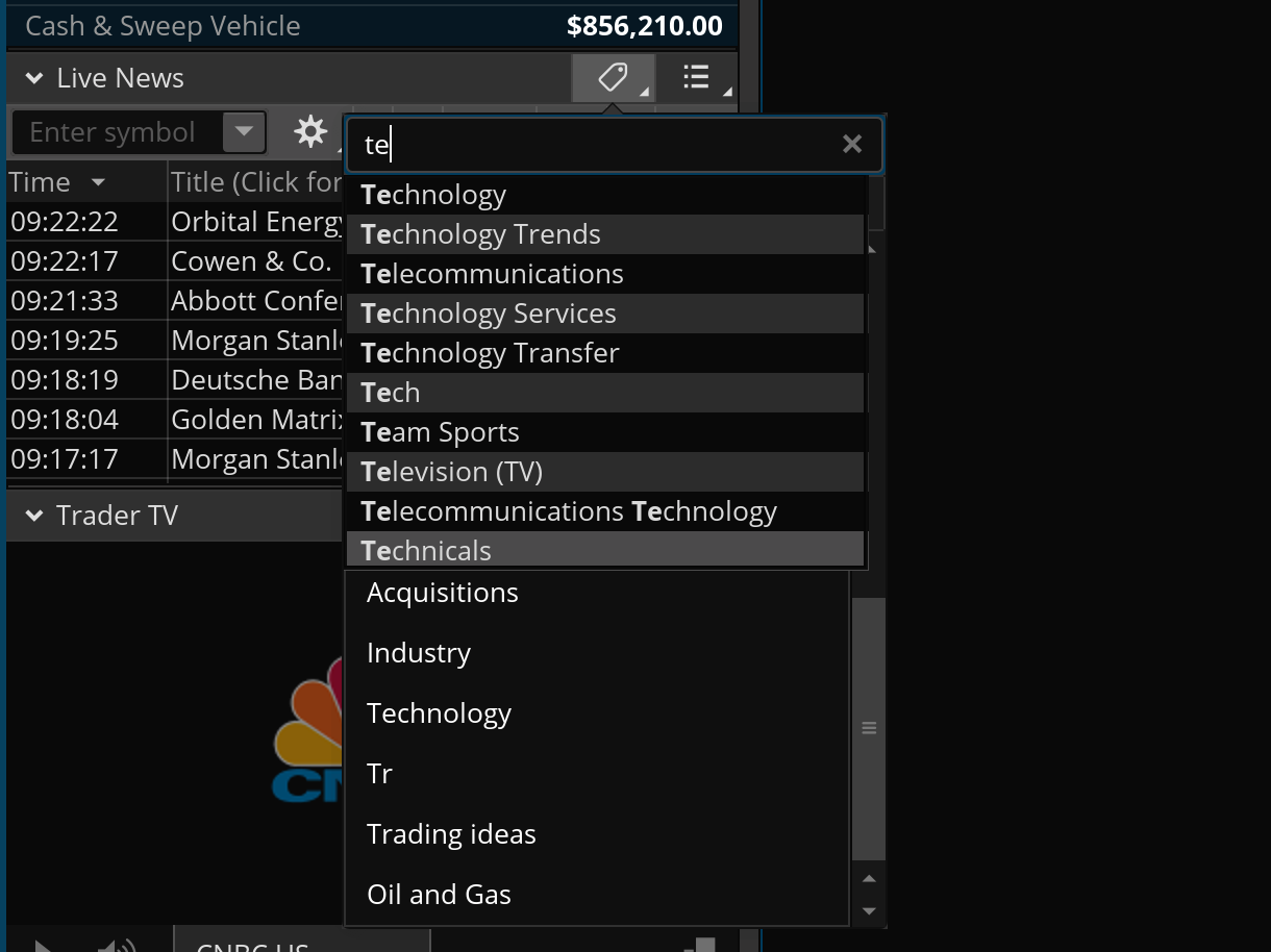 Live News is a thinkorswim gadget that enables you to view, manage, and act on news stories coming live from multiple sources. Using this gadget, you can filter the news feed by symbol, watchlist, or keyword. In addition, you can place an order on a symbol mentioned in a news item directly in this gadget.