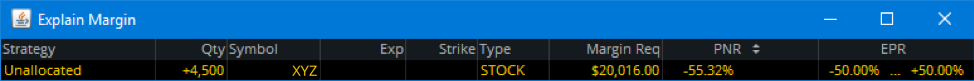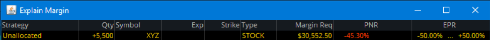 FIGURE 2: EXAMPLE OF RBC MARGIN EXPOSURE. Note how the PNR is now in red, this indicates this position has exposure. In this example, XYZ has the base requirement of 40%, but the exposure would cause the requirement to become 50%. Source: thinkorswim. For illustrative purposes only. Past performance does not guarantee future results.