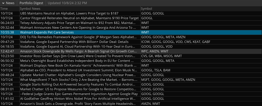 In the News/Portfolio Digest section, you can view a feed of news items related to the symbols currently present in your portfolio. Each news item shows the time of release, headline, and the list of symbols mentioned in it. The newsfeed is periodically updated, and you can see the timestamp of the latest update in the section header.