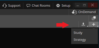 in the top right corner of the window. In the dropdown that appears, select Study or Strategy, depending on what you wish to create. Remember: strategies should have at least one simulated order while studies must have none.