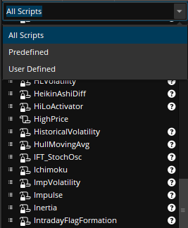 - Alternatively, you can select a study or a strategy from the pane on the left. The list of studies and strategies in this pane is consistent with the list in Studies > Edit studies... in the Charts interface and Chart gadget. Use the dropdown above the list to choose which studies and strategies to show: predefined, user-defined, or all. If you open a script that has already been opened in the main or the detached window, you will be redirected to that window.