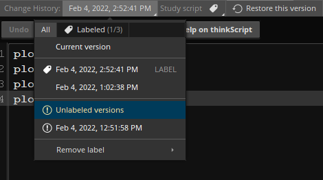Note: When you add a study or strategy with a script that has multiple versions, the system will calculate it based on its current-version script. If you would like to calculate it based on another version, consider restoring that version as the current one or saving it under a different name. - When you edit the same script in different instances of thinkorswim, it is saved as different versions of the same script.
