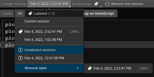 Note: this will erase any changes you’ve made in the current version. Consider clicking Save first to store the current version. You can also click Undo to undo restoring of a past version. - Consider labeling your script versions so you will be able to tell one from another. To do so, select a version you would like to label and click on the label icon. Type in the desirable label and click OK. The label will be displayed next to this version’s name on the list.