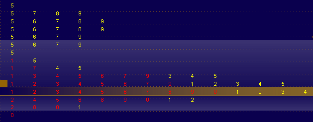 The time period is split into aggregation periods, each one is assigned a digit. If a certain price or a price range is traded over a given aggregation period, it is assigned the corresponding digit. The first aggregation period is assigned 1, the next is assigned 2 - and so forth (up to 10, which is displayed as 0). Note that if the number of aggregation periods exceeds 10, each next ten is also represented by a sequence of digits starting with 1 but shown in a different color. The sequence of colors used to distinguish the tens is shown in the left upper corner of the chart.