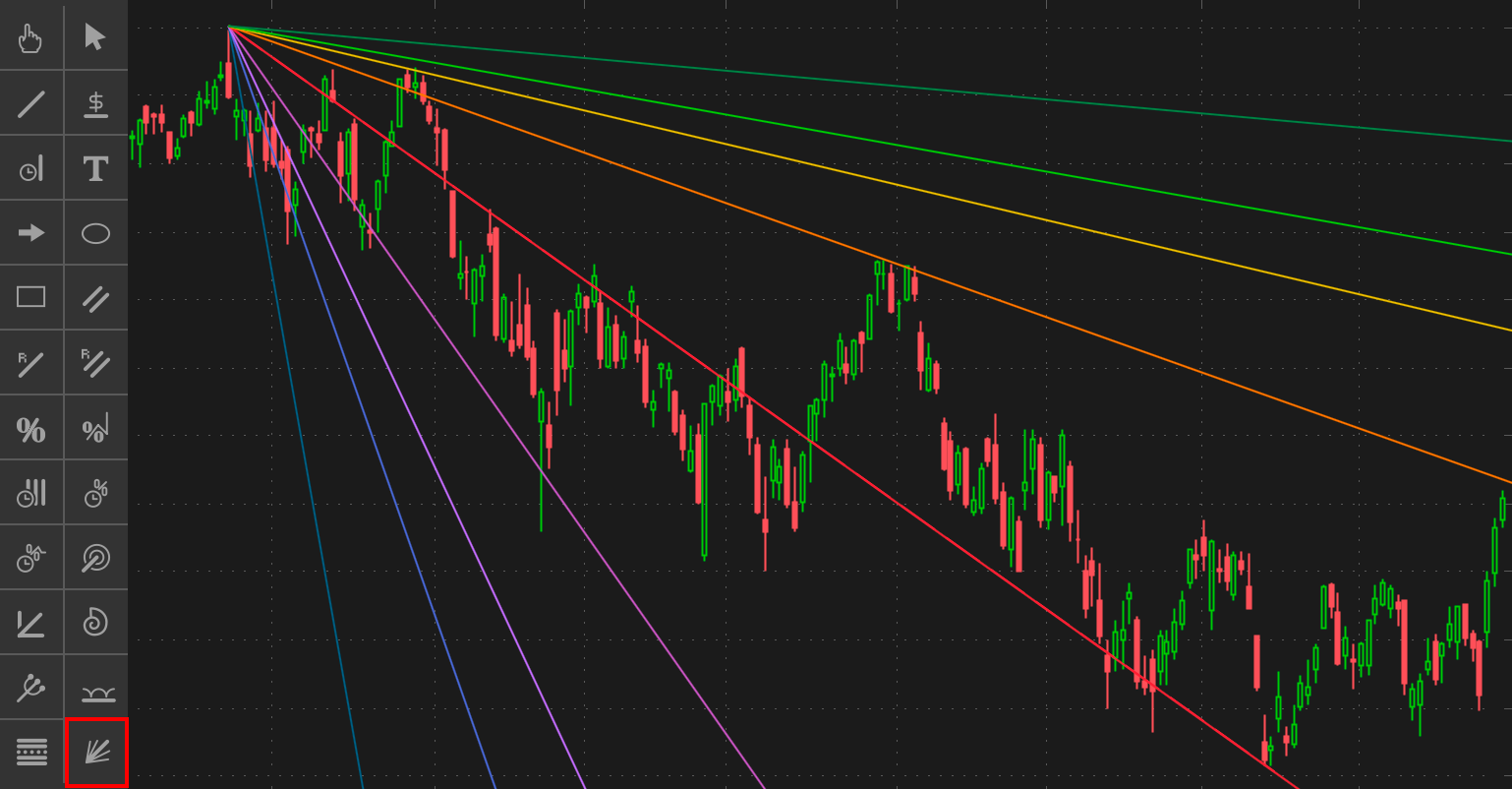 To add the Gann Fans drawing to chart, select it from the Active Tool menu. Specify begin and end points of the trendline; other default ratio lines will be added automatically. Note that you can modify the ratio for any line using the drawing properties.
