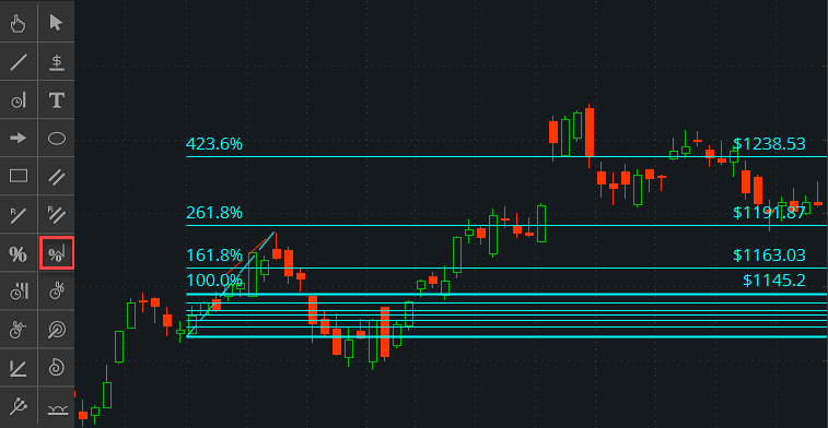 In order to add the Fibonacci extensions drawing to chart, choose it from the Active Tool menu. Specify begin and end points of the trendline and extension line; the retracement levels will be calculated automatically.