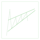 The Rising Wedge pattern resembles the Ascending Triangle: both patterns are defined by two lines drawn through peaks and bottoms, the latter headed upward. However, in case of the Rising Wedge, the upper line also moves up to the right and its slope is less than that of the lower trendline. A decent Rising Wedge has at least five reversals: three for one trendline and two for the opposite.