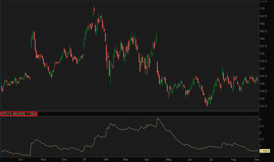 By default, the average true range is a 14-period Wilder's moving average of this value; both the period and the type of moving average can be customized using the study input parameters.