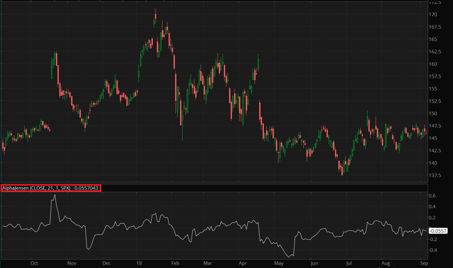 The Jensen's Alpha study calculates the average return of a security or portfolio relative to that of a benchmark index. In mathematical sense, it is equal to average rate of change in security's price minus that of the benchmark index multiplied by its Beta. Jensen's Alpha assumes that the security has a Beta of 1.0.