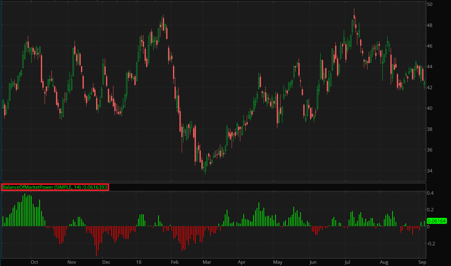The Balance Of Market Power study is calculated as the ratio of the differences between the Close and the Open and between the High and the Low. It can also be smoothed with a moving average of a selected type.