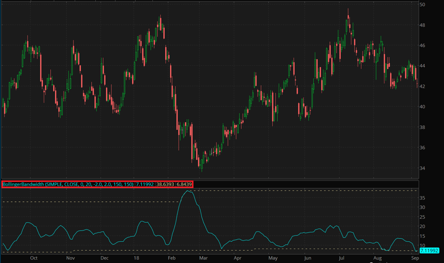 The Bollinger Bandwidth® study is a technical indicator based upon Bollinger Bands® study, expressing the distance between upper and lower bands as percentage of the middle band value (moving average around which the bands are plotted). The main plot is accompanied with two additional ones: Bulge and Squeeze. Bulge plot displays the highest bandwidth value reached on the specified period, and, similarly, Squeeze plot shows the lowest bandwidth value.