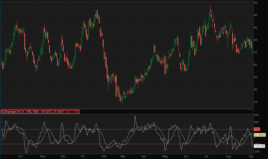 The CCI Average study plots an average of the Commodity Channel Index over a defined time period.