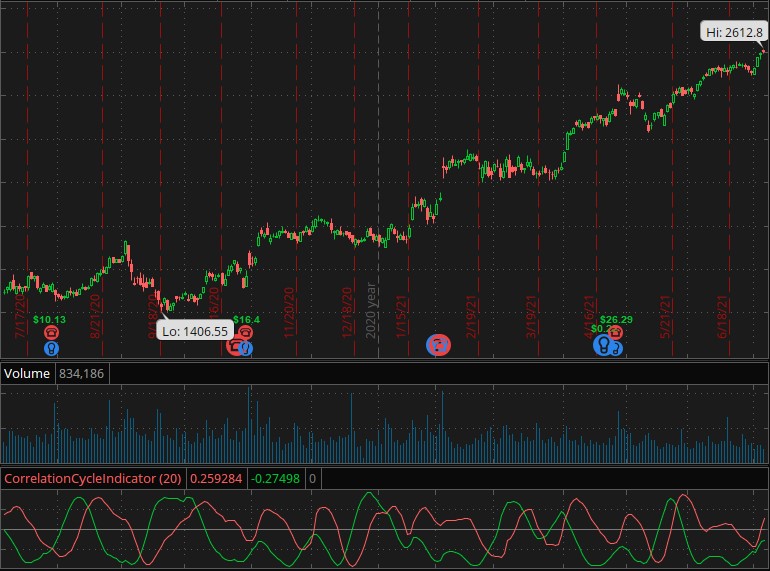 The Correlation Cycle Indicator analyzes the correlation of the price with a cosine wave over a presumed wavelength of the cycle. This indicator is best used when the market is in the cycle mode. The plot of the correlation of the price with a cosine wave may help identify turning points as it forms peaks and valleys coinciding with peaks and valleys in the price.