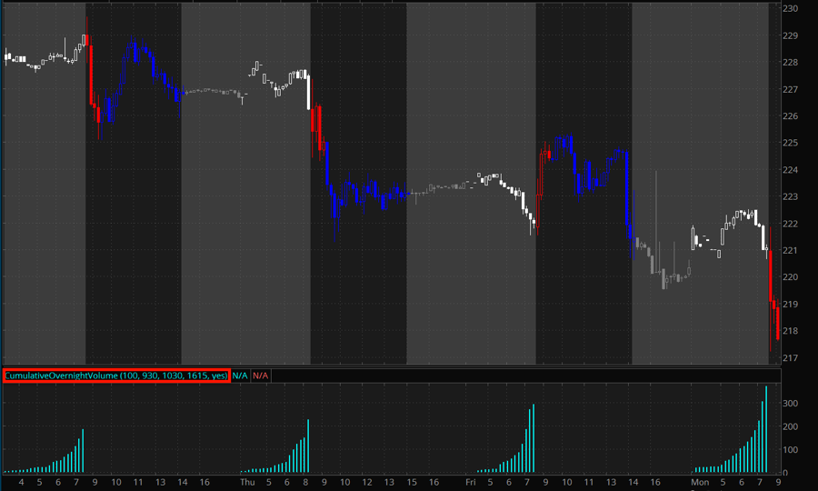 The Cumulative Overnight Volume is a technical indicator that detects unusually high volume during the overnight trading session. Based on the observation that nightly volume is very often proportionate to both daily volume and daily volatility, the study can be used when assessing possible daily price range. Mathematically, the study compares the volume traded last night (from midnight to 8:30 am Central Standard Time (CST)) to the average nightly volume over the last five trading days. Note that since thinkScript uses timestamps based in Eastern Standard Time (EST), the default numbers in the input parameters are adjusted accordingly. Note also that the study will only work on intraday charts with a maximum aggregation period of 1 hour.