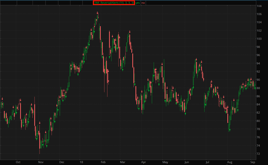 Crossovers of DMI Stochastic Extreme's Stoch plot below its SMA. |