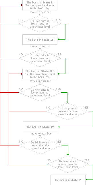 Use the following flowchart to retrace the Darvas Box calculation mechanism. Band levels are calculated on the bar-by-bar basis, starting from the first bar on chart, which is assigned State I.