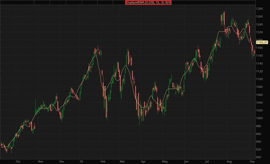 The Displaced Exponential Moving Average moving average is a study calculating a moving exponential average and shifting it forward or backward in time for a specified period.