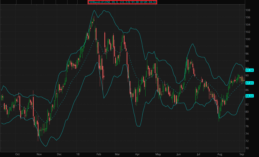 The Exponential Standard Deviation (ESD) Bands are a volatility-band technical indicator proposed by Vitali Apirine. This indicator comprises two lines (bands) plotted, by default, two exponential standard deviations above and below an exponential moving average. The exponential standard deviation is equal to the root mean square of price deviations from its exponential moving average.
