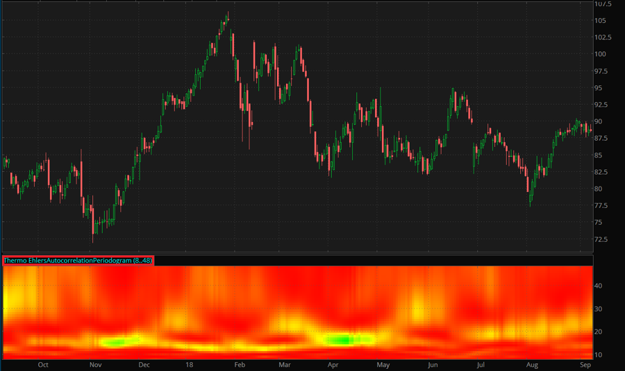 As the first step, the Autocorrelation Periodogram takes Autocorrelation of price data filtered by Ehlers Roofing Filter. The Autocorrelation function compares the data with itself a certain period back; its value of +1 would signify the perfect correlation and -1, the perfect anti-correlation. Values produced by Autocorrelation are then subjected to Fourier transform and the resulting data is plotted in Thermo Mode.