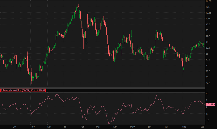 The Ehlers Highpass Filter is a technical analysis tool developed by John F. Ehlers. Based on aerospace analog filters, this filter aims at reducing noise from price data. Ehlers Highpass Filter eliminates wave components with periods longer than a certain value.