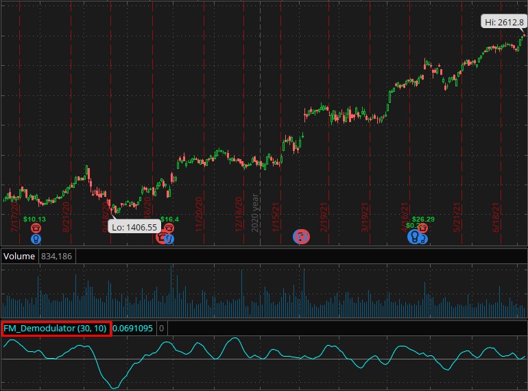 FM Demodulator is a technical indicator that singles out the frequency modulation component out of market data cycles. It does so by applying a hard limiter that eliminates all amplitude information from the market data spectrum. Based on signal processing techniques, this indicator can help detect potential turning points in market data.