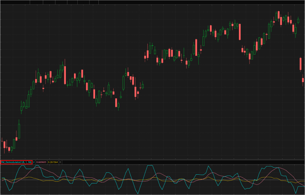 The modified FM Demodulator is a technical indicator that singles out the frequency modulation component out of market data cycles. It does so by applying a hard limiter that eliminates all amplitude information from the market data spectrum. Based on signal processing techniques, this indicator can help detect potential turning points in market data. As opposed to the plain FM Demodulator, it calculates the hard limiter filter based on the two-bar price momentum instead of the difference between the close and open.