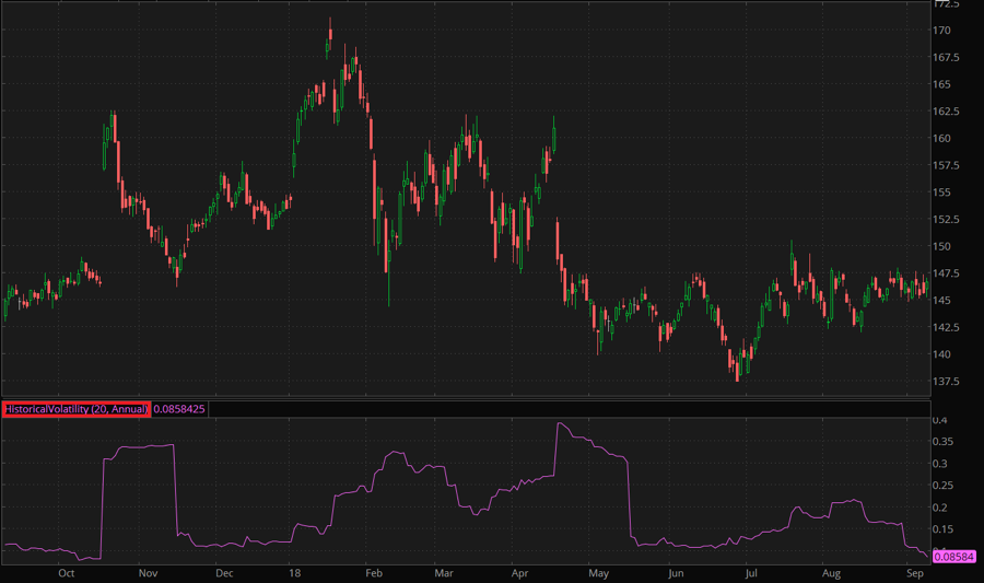 The Historical Volatility study calculates volatility which can be expressed by the following formula: