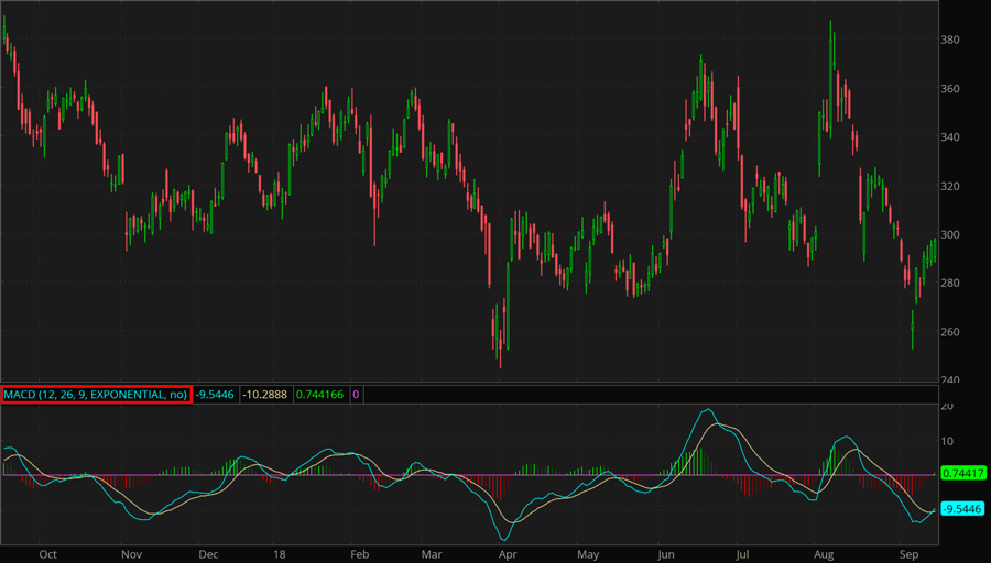 MACD (Moving Average Convergence/Divergence) is an oscillator study that is widely used for assessment of trending characteristics of a security. Calculated as the difference between two price averages, this indicator also provides a signal line, an average of that difference. Crossovers of the MACD plot and the signal line often produce valuable signals for trend analysis.