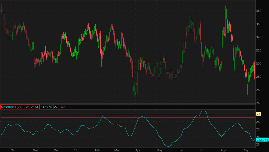 It is considered a trend reversal signal, when the Mass Index surpasses the setup level and then falls below the trigger level.