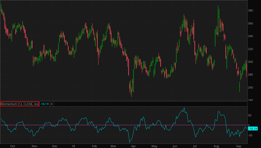 The Momentum study measures the velocity of price changes over a fixed time period. By default, the momentum is calculated as the difference between the latest close price and the close price 12 bars prior to it. Both the price type and the offset period are customizable.