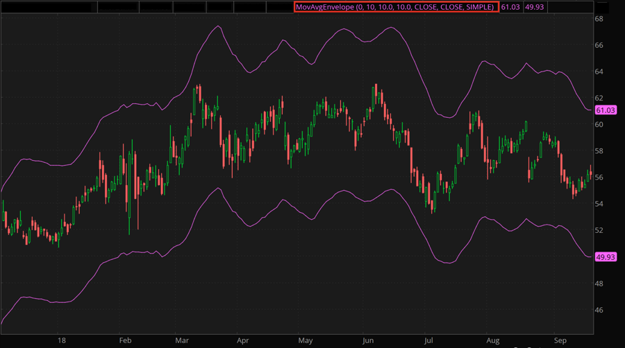 The Moving Average Envelope study calculates a moving average of specified type and length and plots it shifted up and down by a specified percentage. Upper and lower bands can be used as overbought and oversold levels respectively.