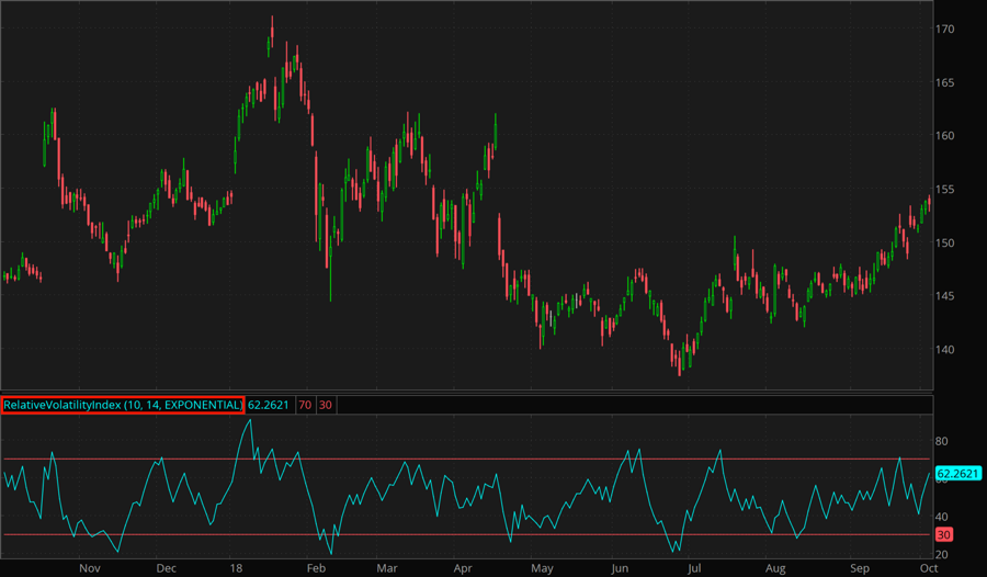 The RVI measures the direction of volatility on a scale from 0 to 100. Readings greater than 50 indicate that the volatility is more to the upside. Readings lower than 50 indicate that the direction of volatility is to the downside.