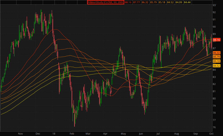 The Ribbon Study consists of 8 Simple Moving Average plots having different lengths thus forming a "ribbon". The lenghts of those averages are in an arithmetic progression relation: the increment of the progression is defined by the initial and the final Moving Average lengths.
