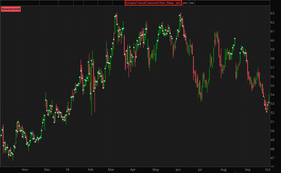 The Simple Trend Channel Filter study is part of a trading system developed by James E. Rich and John B. Rich. Being the first step in the system, a filter, it recognizes symbols suitable for application of the strategy. Like many other study filters, it has been adapted for usage in thinkorswim Stock Hacker.