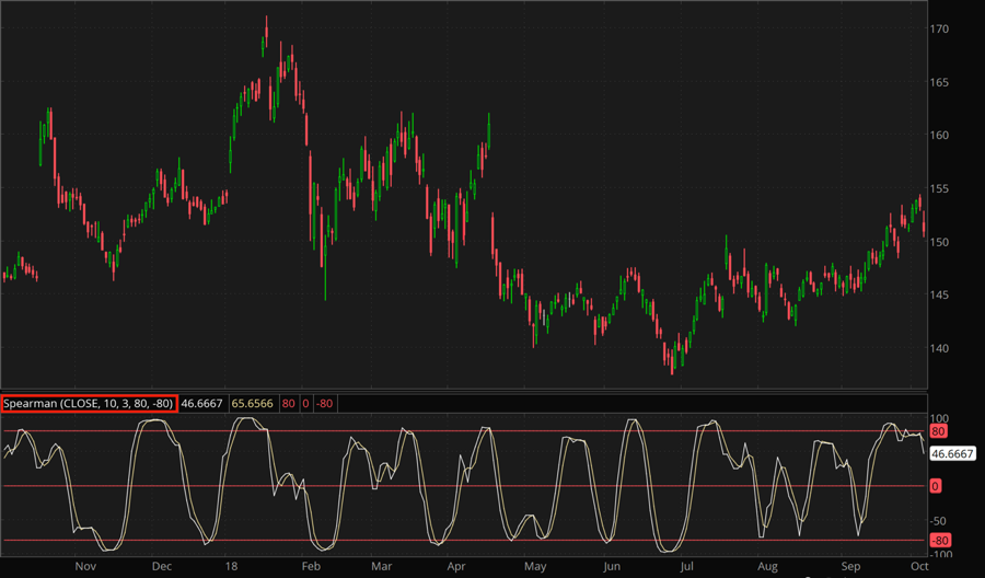 Since the extreme values of -100 and +100 are rarely recorded, values of +80 and -80 might be used as overbought and oversold levels respectively. Plotting the Spearman indicator along with its short SMA (e.g., three day SMA on daily charts) might give an idea when to expect the turning points: look for the crossovers of the two plots. Useful information can also be obtained by analyzing action of the indicator in relation to zero level: crossing above the zero level might be an opportunity for the Long Entry while falling below zero might suggest the Short Exit.