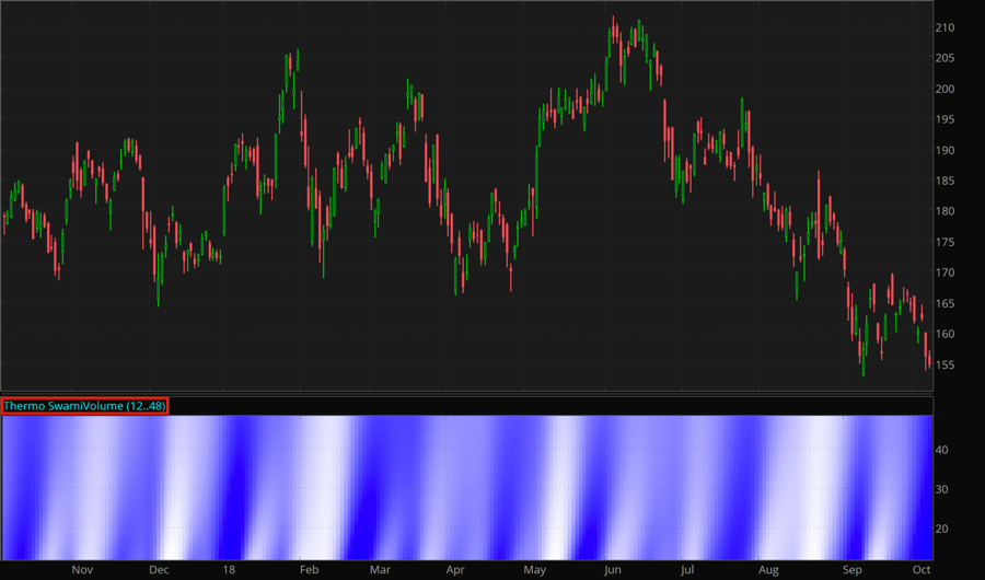 The Swami Volume study is a technical indicator designed for Thermo Mode; it shows volume relative to its average. Like in all Thermo Mode specific studies, shorter lookback periods reflect recent changes, middle range periods are used for confirmation, and the longest ones signify possibility of continuation.