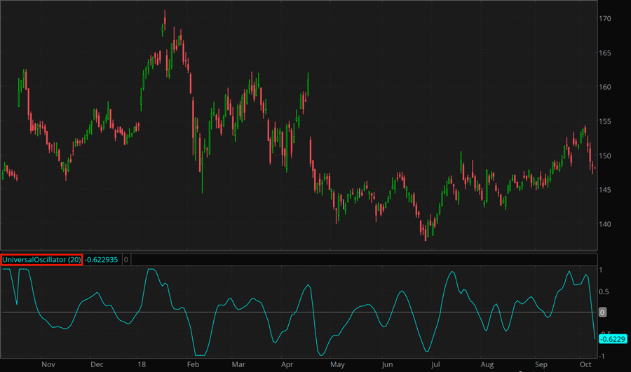 The Universal Oscillator continues the series of technical indicators proposed by John Ehlers, based upon signal processing techniques. In his article, "Whiter is Brighter," Dr. Ehlers discusses that market data is akin to "pink noise" (a scientific term that refers to a type of noise where the power spectral density is stronger at lower frequencies). Isolating the white spectrum (whose power spectral density is the same at all frequencies) is said to output data that can be transformed into a zero-lag oscillator.