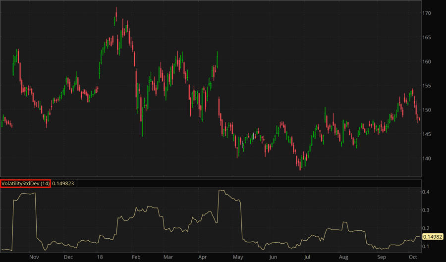 The Volatility Standard Deviation study calculates the standard deviation of one-bar holding period return of a security multiplied by the square root of time in days (where a trading year has 252 days).