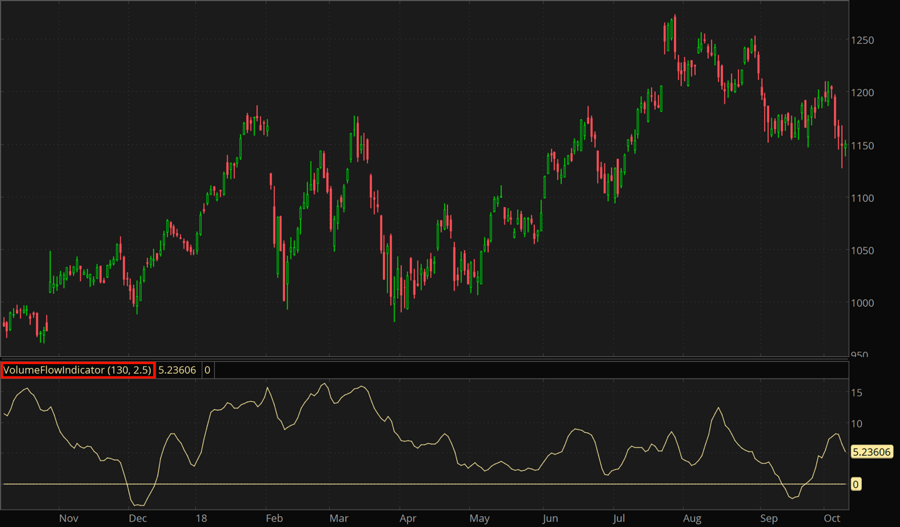 The Volume Flow Indicator is also used for spotting divergence; divergence in volume might signify trend reversal. Trend might be losing momentum when the Volume Flow Indicator fails to confirm a new High or Low in a cycle.