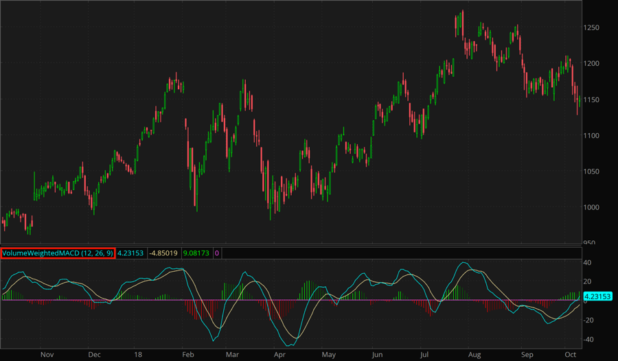 The Volume Weighted MACD is a modified version of MACD study. It calculates volume-averaged Close price on two periods: longer and shorter ones. First average is called "slow" and the second is called "fast"; Volume Weighted MACD is equal to the difference between these two values. The main plot is accompanied with its EMA and a histogram showing the difference between these two values (EMA is subtracted from the Volume weighted MACD).