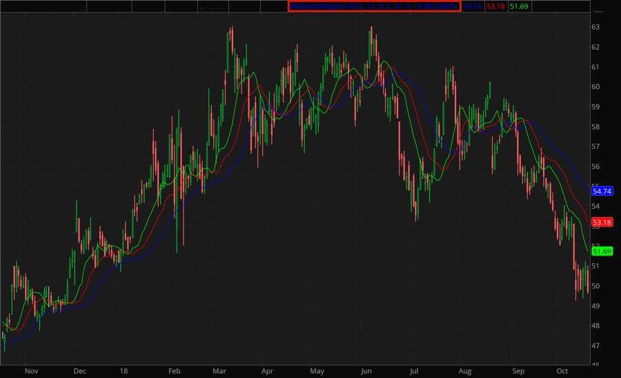 The Williams Alligator study is a moving average based trend-following indicator. It consists of three lines: Jaw, Teeth, and Lips, each being a moving average of price. Jaw line is the slowest average shifted by longest distance forward. Teeth and Lips averages use smaller periods and forward displacements, with Lips being the fastest of the three and shifted by shortest distance.